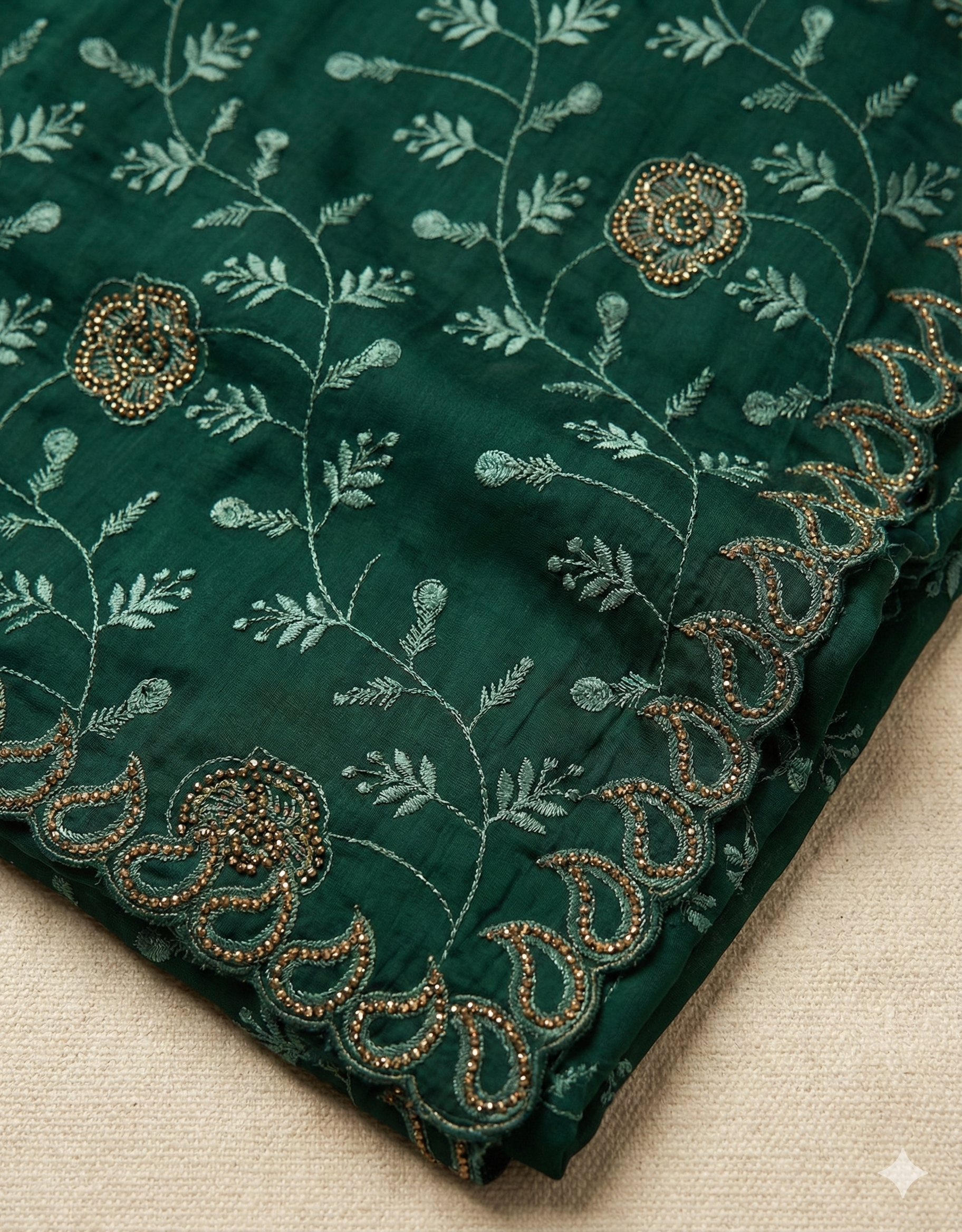Dark Green Embroidered Saree with Stone Work & Scalloped Border
