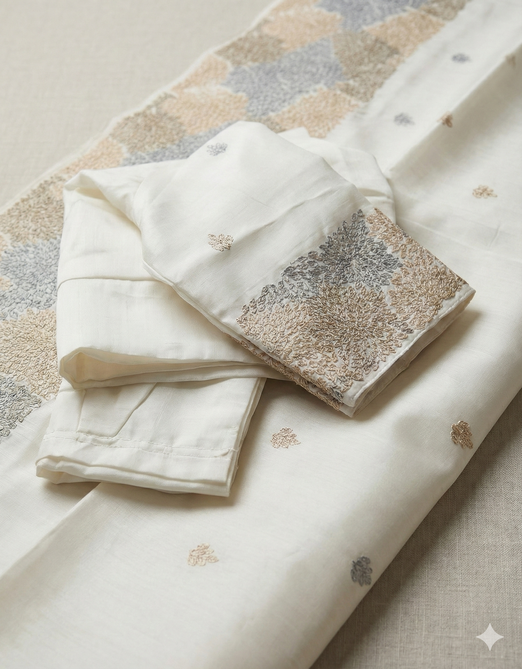 Ivory Geometric Embroidered Silk Saree (Includes Stitched Blouse Size 38)