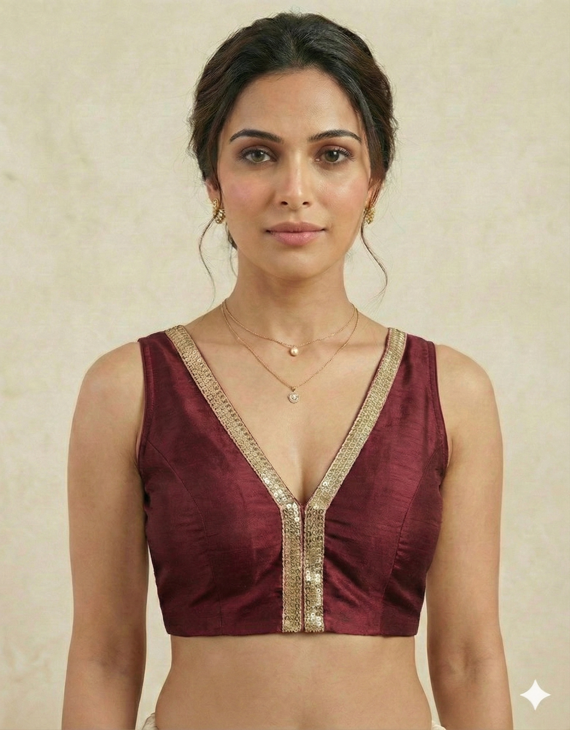 Designed for the modern woman who values both style and convenience, this readymade blouse is a wardrobe essential. Crafted from premium art silk with a raw-silk finish, it features a stunning deep V-neckline highlighted by a vertical gold sequin and zari border that adds instant glamour to any saree.