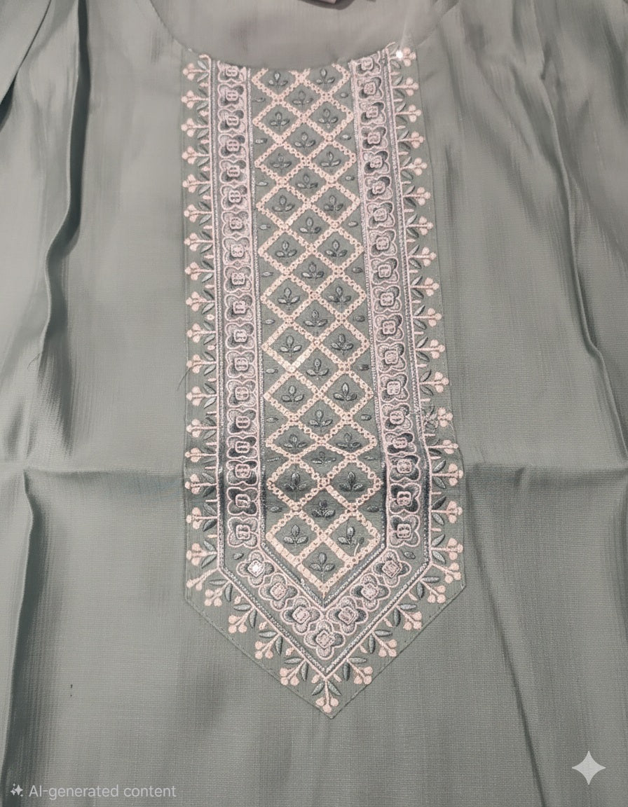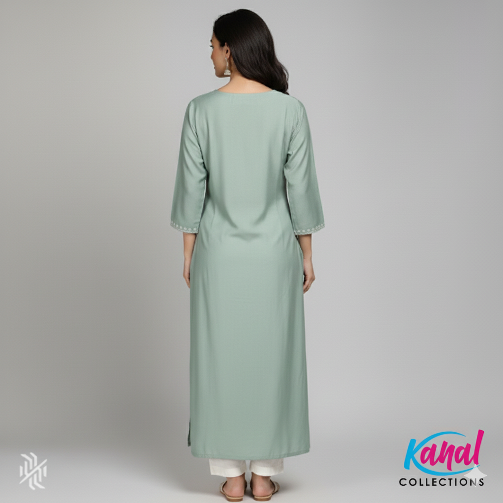 Elevate your everyday wardrobe with the Kanal Collections Embroidered Kurti. Designed for the modern woman who values both comfort and traditional grace, this piece features intricate white embroidery along the neckline and sleeve cuffs, set against a soothing mint sage fabric.