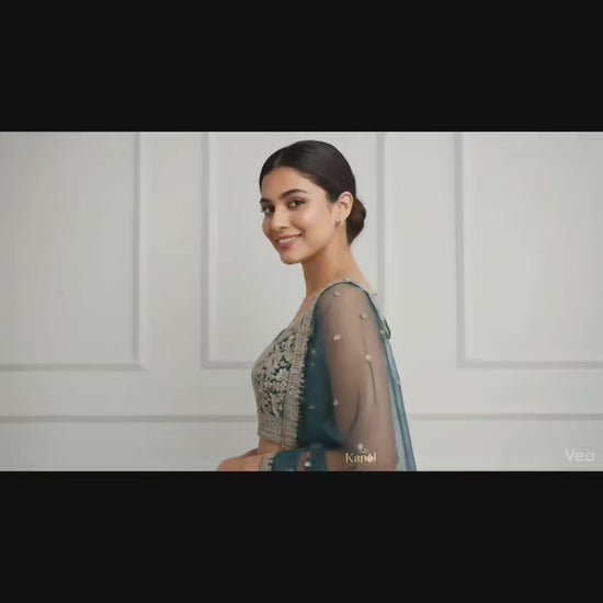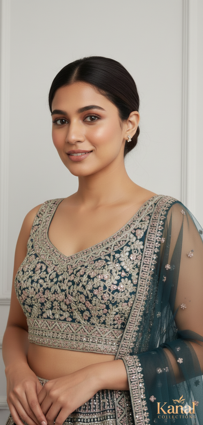 Elevate your wedding wardrobe with this exquisite deep teal lehenga, a perfect blend of high-fashion structure and traditional craftsmanship. Designed for those who want to stand out without wearing traditional bridal red, this ensemble is the ultimate choice for a Grand Reception, Sangeet night, or for the Sister of the Bride/Groom.